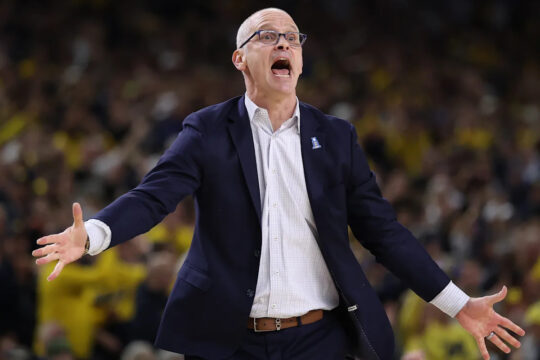 UConn’s Dan Hurley laughs at officiating questions after Michigan National...