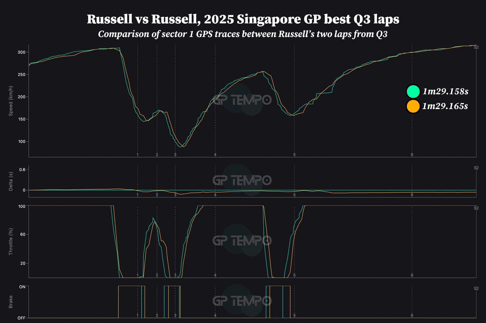 Examining the GPS data provides valuable insight. Compared to his Q3 benchmark (indicated in yellow), Russell exhibited a more cautious approach in the opening sector during his second attempt (represented in teal). He initiated braking earlier for each corner in this initial phase, but achieved quicker power application. Despite this, he trailed his best time by 0.11s at Turn 3, although he managed to narrow the gap through increased acceleration upon exiting the corner.