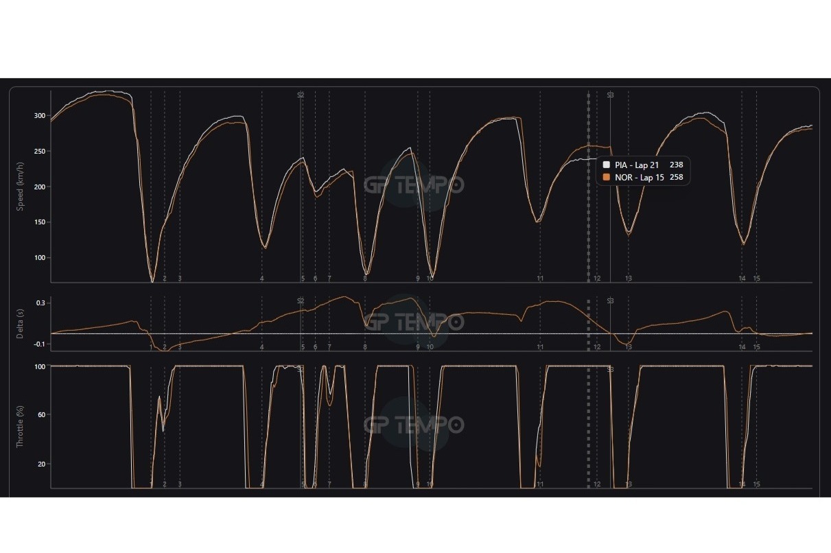 The velocity profiles for both laps displayed considerable differences, despite their almost identical lap times—a mere 0.010-second disparity. Piastri attained superior top speeds on the straights leading into Turns 1, 4, and 14 during his Thursday lap. In all these instances, both drivers maintained full throttle throughout, indicating that Norris likely utilized more super clipping in those track segments on Friday, consistent with McLaren’s intensified super clipping tests that day.